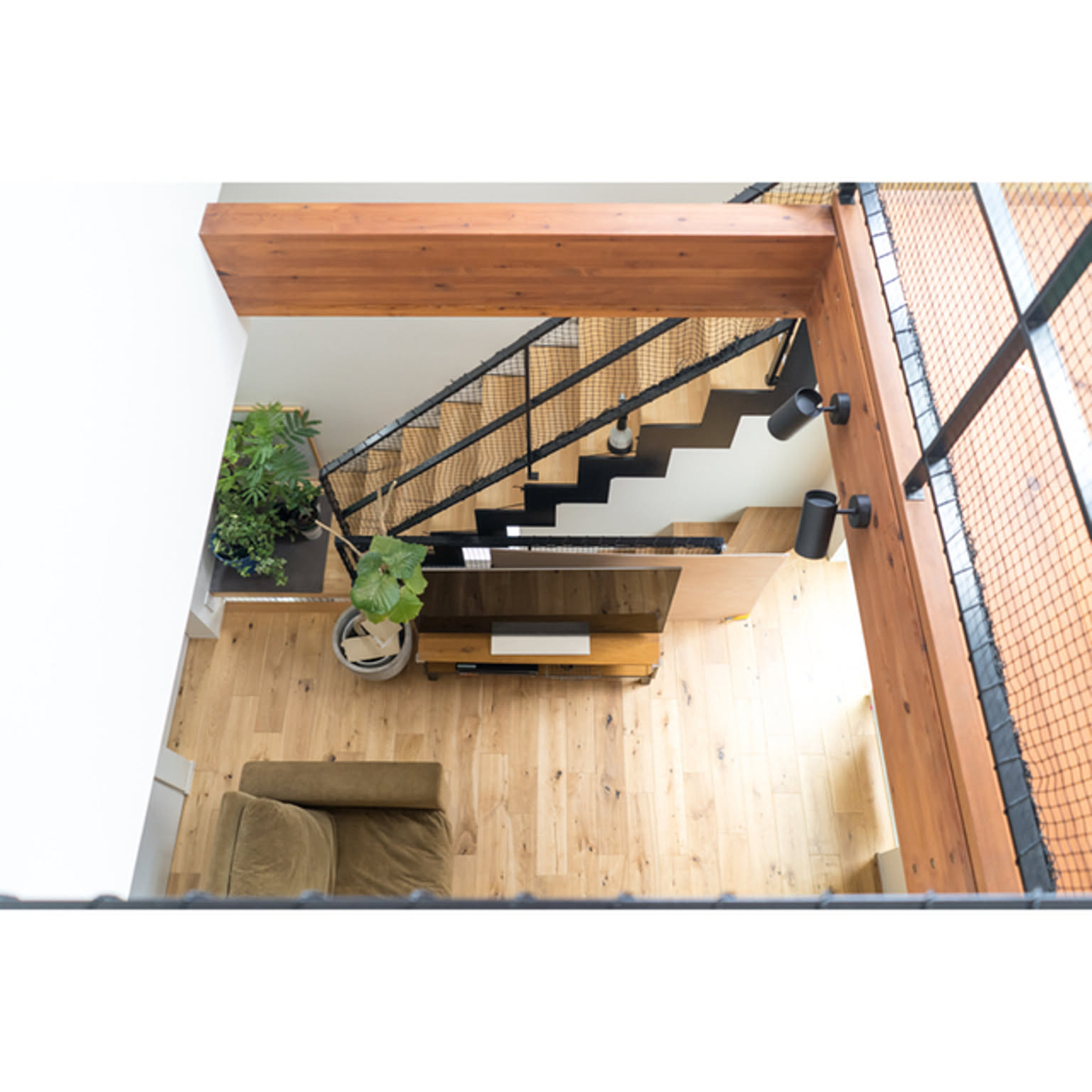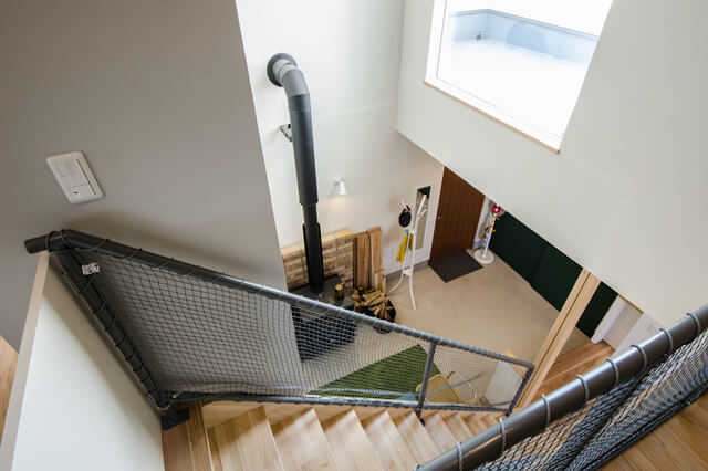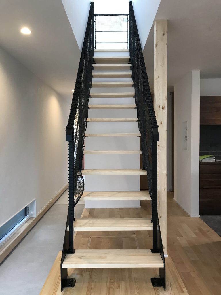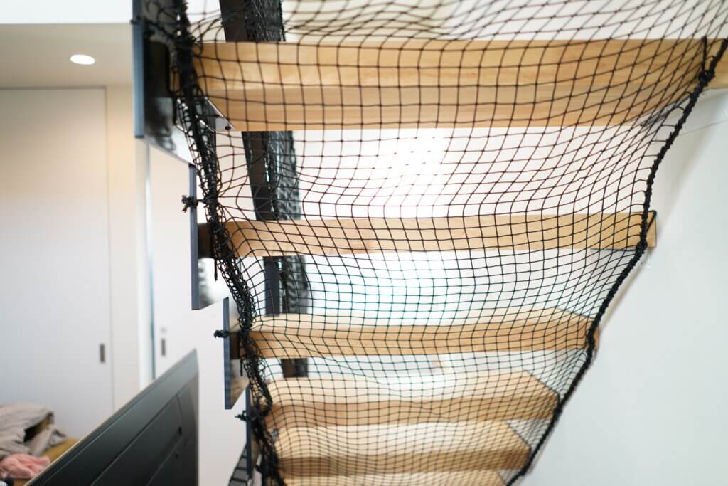 吹き抜け部のスケルトン階段に転落 落下 防止ネットを取り付けました。これで小さな子供がいても安全です。