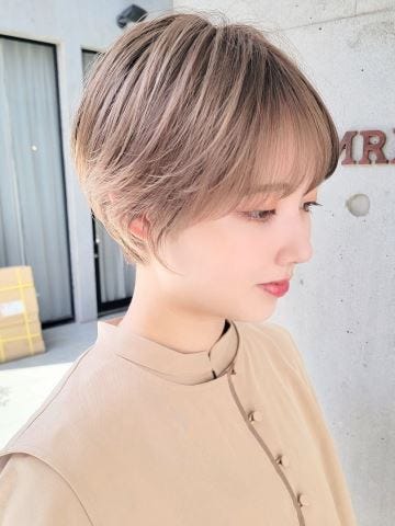 大人ショート 大人ショートボブ ミルクティーベージュ くびれショート丸型×ショートの40代-50代におすすめシースルーバング×ローレイヤー×モカブラウングレイカラー・白髪染めのモテ・愛されヘアスタイル- OZmallヘアサロン予約。