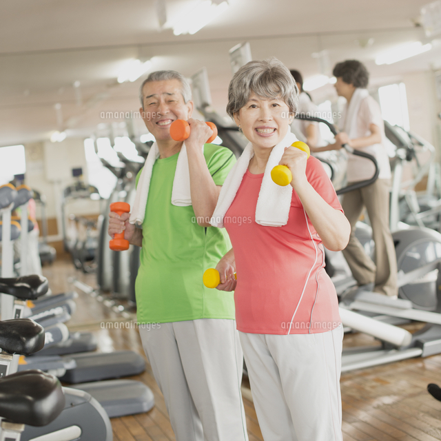 ジムで運動をするシニア夫婦 11017007709 の写真・イラスト素材アマナイメージズ。