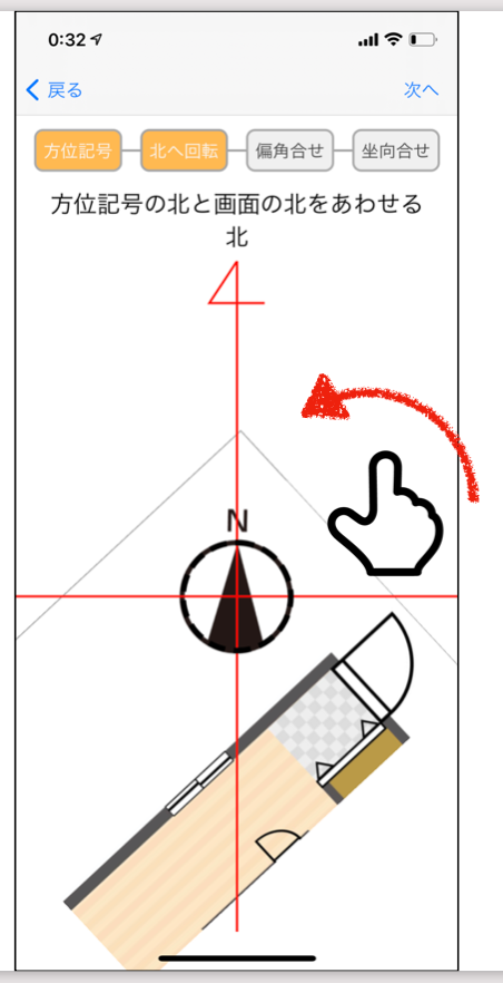 現在地を示す矢印の方向がおかしい使い方野外調査地図。