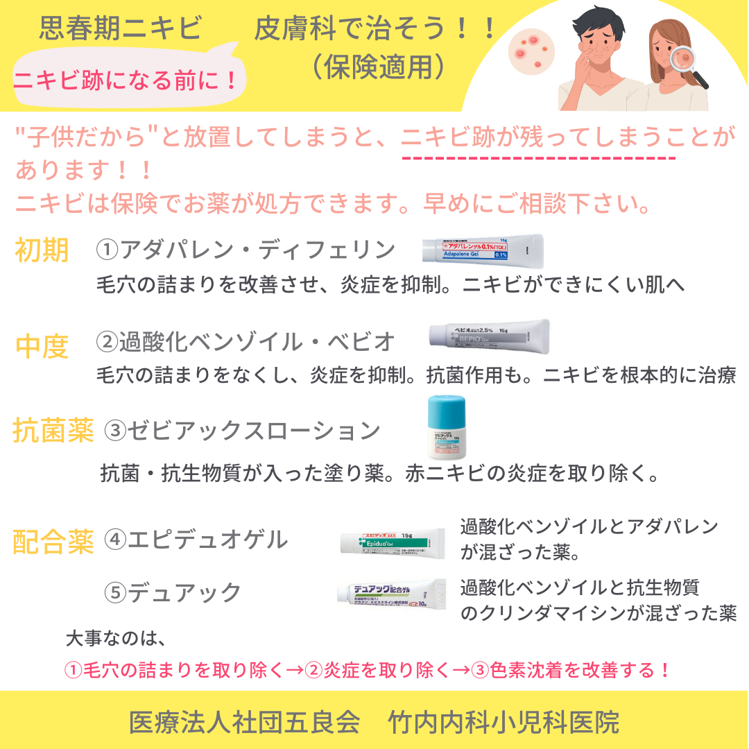 思春期ニキビ 痕になる前に、皮膚科で治そう! 保険適用竹内内科小児科医院。