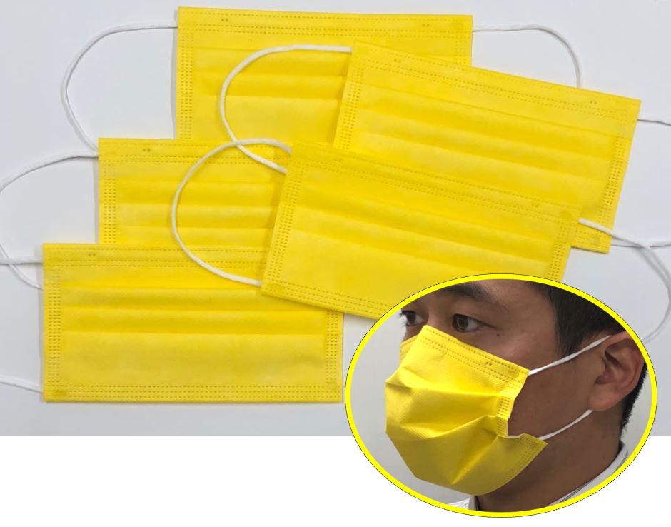 日本製 国産3層構造不織布カラーマスク イエロー 黄 5枚入株式。