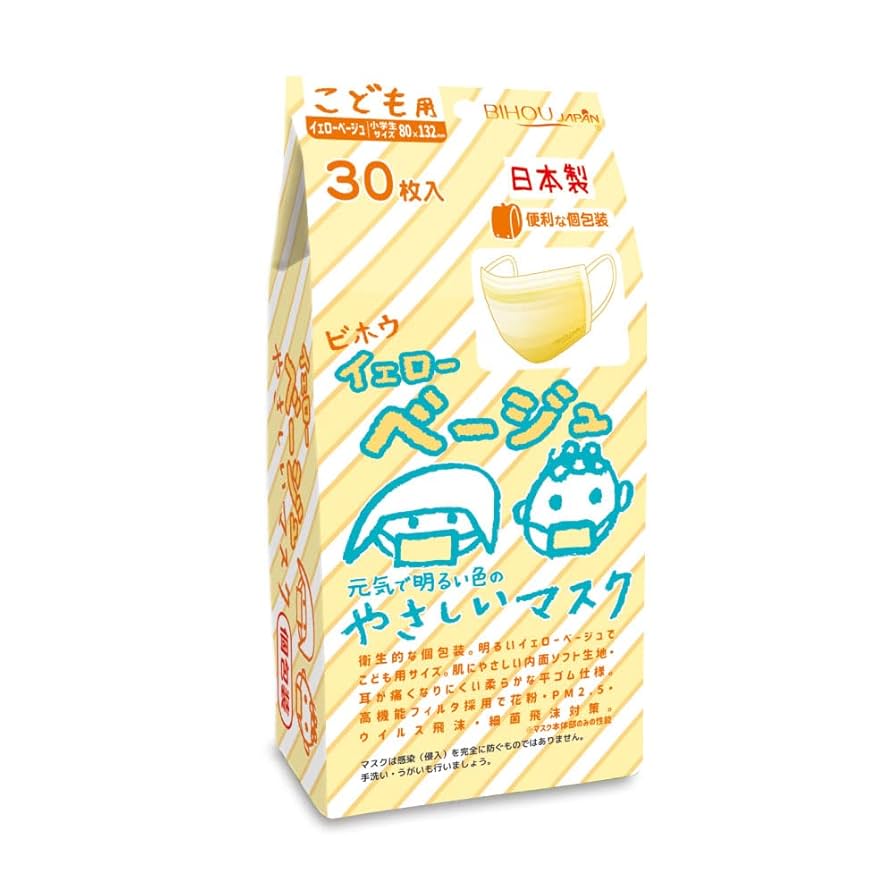 Amazon.co.jp:ビホウマスク 安心の日本製 使い捨て不織布マスク 耳が痛くならない柔らかな平ゴム・肌にやさしい内面ソフト生地仕様元気で明るいイエローベージュ色 小学生用 こども用イエローベージュやさしいマスク 個包装30枚入 : ドラッグストア。