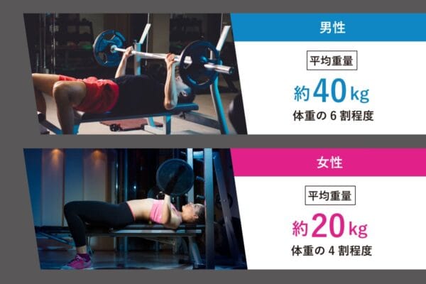 ベンチプレスを上げられる平均重量の体重別・男女別の重量。