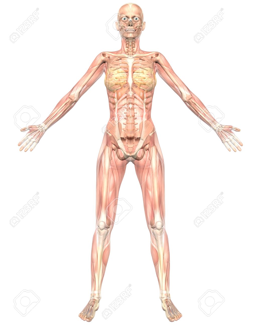 女性の筋肉の解剖学、半透過骨格の解剖学を示す正面のイラスト。非常に教育と詳細。の写真素材・画像素材 Image 10613635。