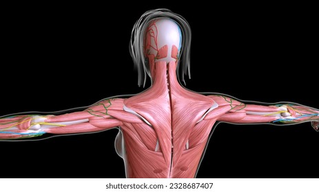 女性の解剖学の3Dレンダリング医療イラスト – 背中の上部の筋肉。黒い背景。プロフェッショナルなスタジオ照明。」のイラスト素材 2229041455Shutterstock。