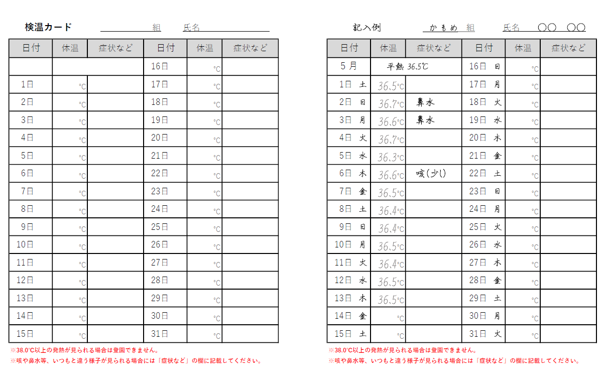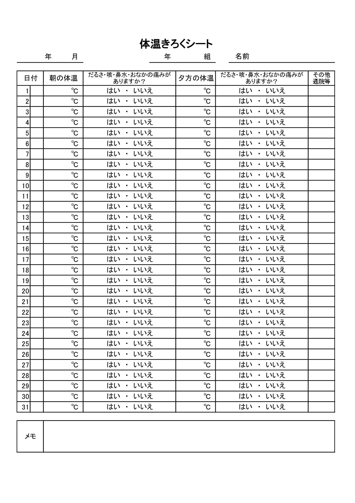 検温表 A4サイズ PDF印刷可 前半・後半別々園だより、おたよりで使えるかわいいイラストの無料素材集 イラストだより。