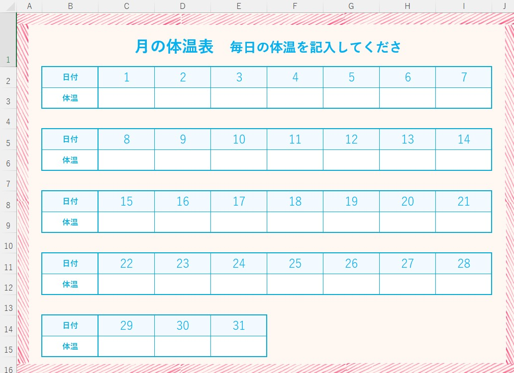 エクセルの基礎体温表 テンプレート - エクセルフリー 無料ダウンロード。