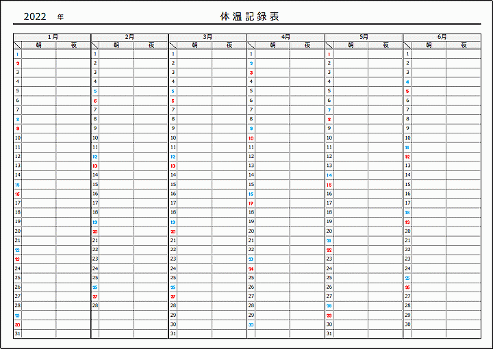 体温記録表:日付と曜日が自動表示・朝と夜の2回、半年間を記録する用紙 - テンプレートの無料ダウンロード。