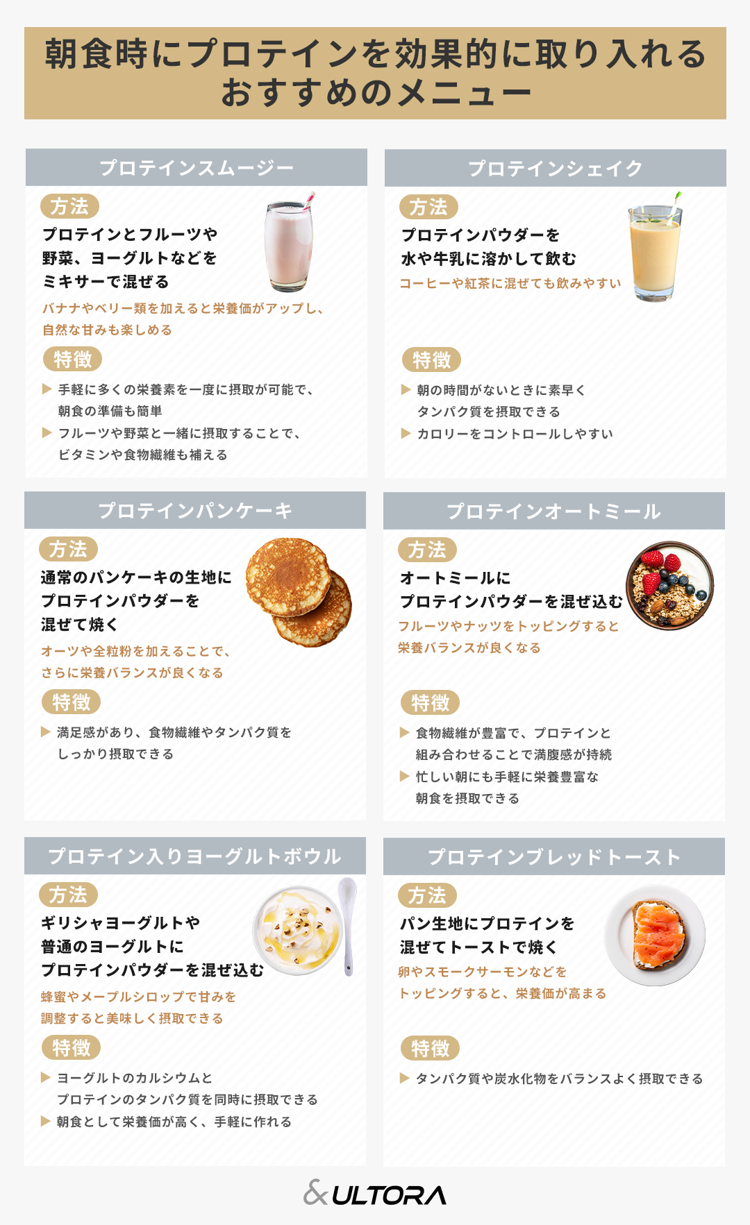朝のプロテインを効果的に摂取する方法を解説!組み合わせにおすすめな朝食メニューも紹介ULTORA ウルトラ 公式ダイエットプロテイン オンラインストア。