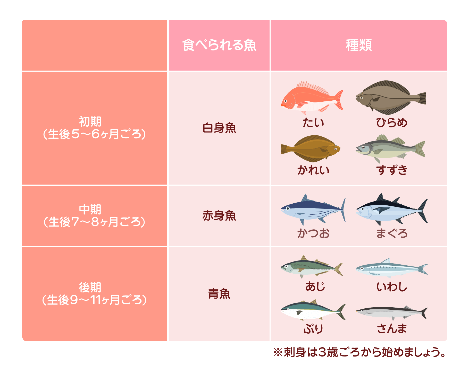 管理栄養士監修離乳食初期・中期・後期別食べられる魚まとめママびよりウェブ。