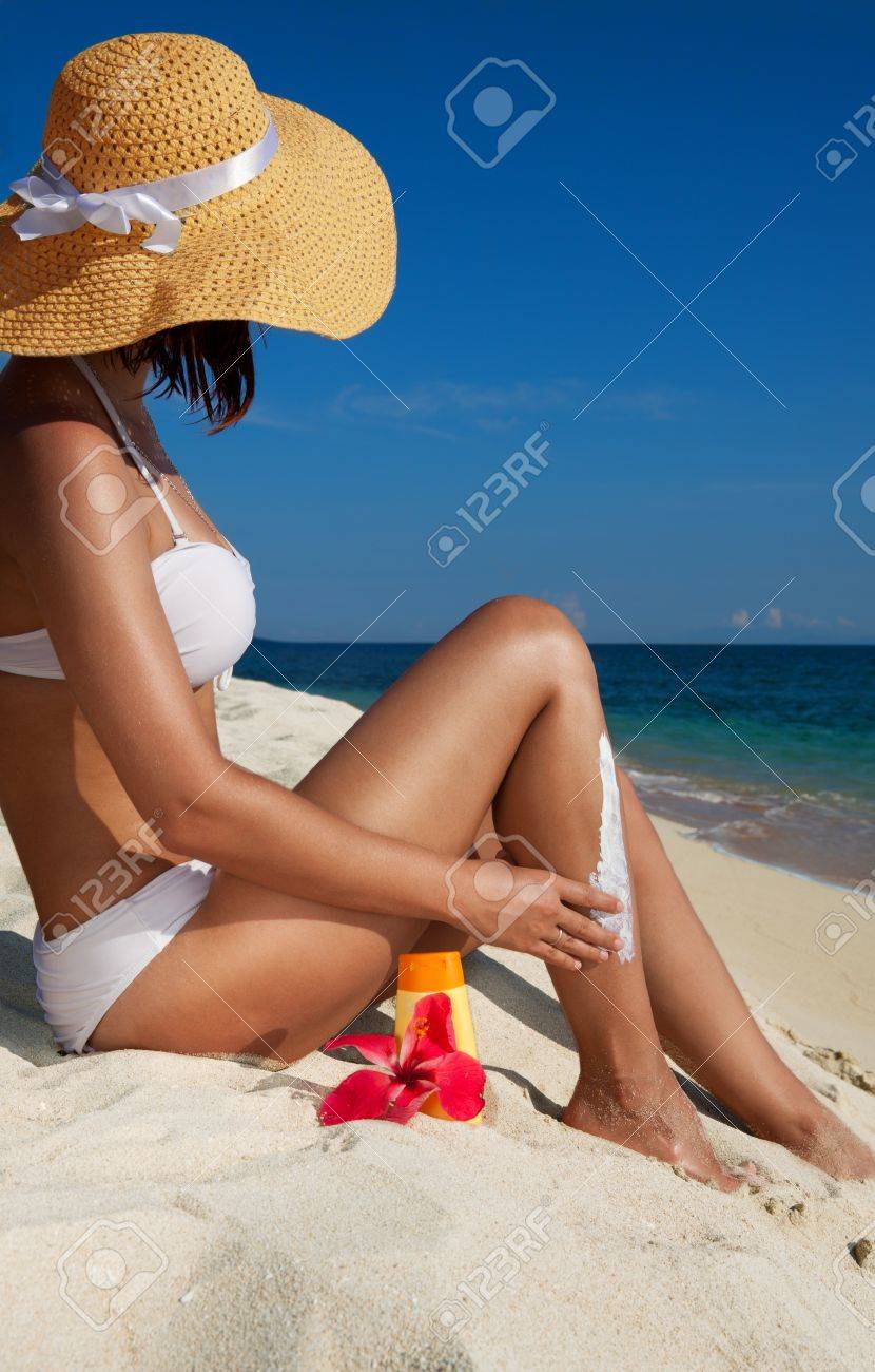 日焼け止めを適用するビーチで日焼けした女性の写真素材・画像素材 Image 15861269。