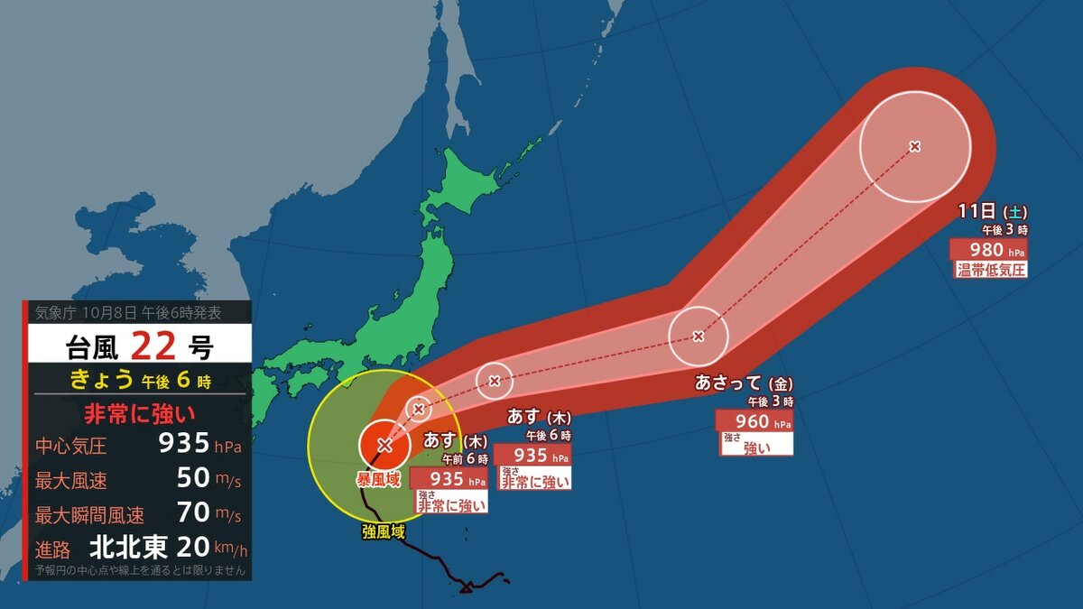 台風情報 「台風22号」急カーブして日本列島沿岸部を西から東へ 今後の進路は? 6日午後11時50分更新 気象庁 10月6日~10月22日までの16日間 天気シミュレーション2025年10月6日掲載- ライブドアニュース。