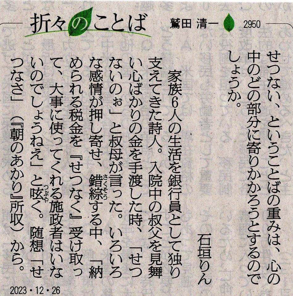 せつない」という言葉・「折々のことば」で、石垣りんさんに教えられたこと78歳のつぶやき・ざれ言・ひとり言。