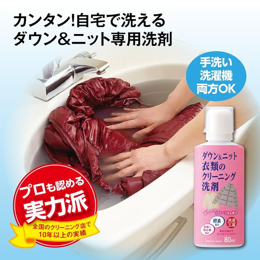 Amazon洗濯工房 ダウン&ニット衣類のクリーニング洗剤 80mL 日本製 ダウン ニット クリーニング 洗剤 かんたん 自宅で洗える専用洗剤 手洗い 洗濯機 酵素 汚れ 分解 弱酸性 色移り防止剤 柔軟成分 洗浄 衛生 お手入れ株式会社エルベ・プランズおしゃれ着洗剤。