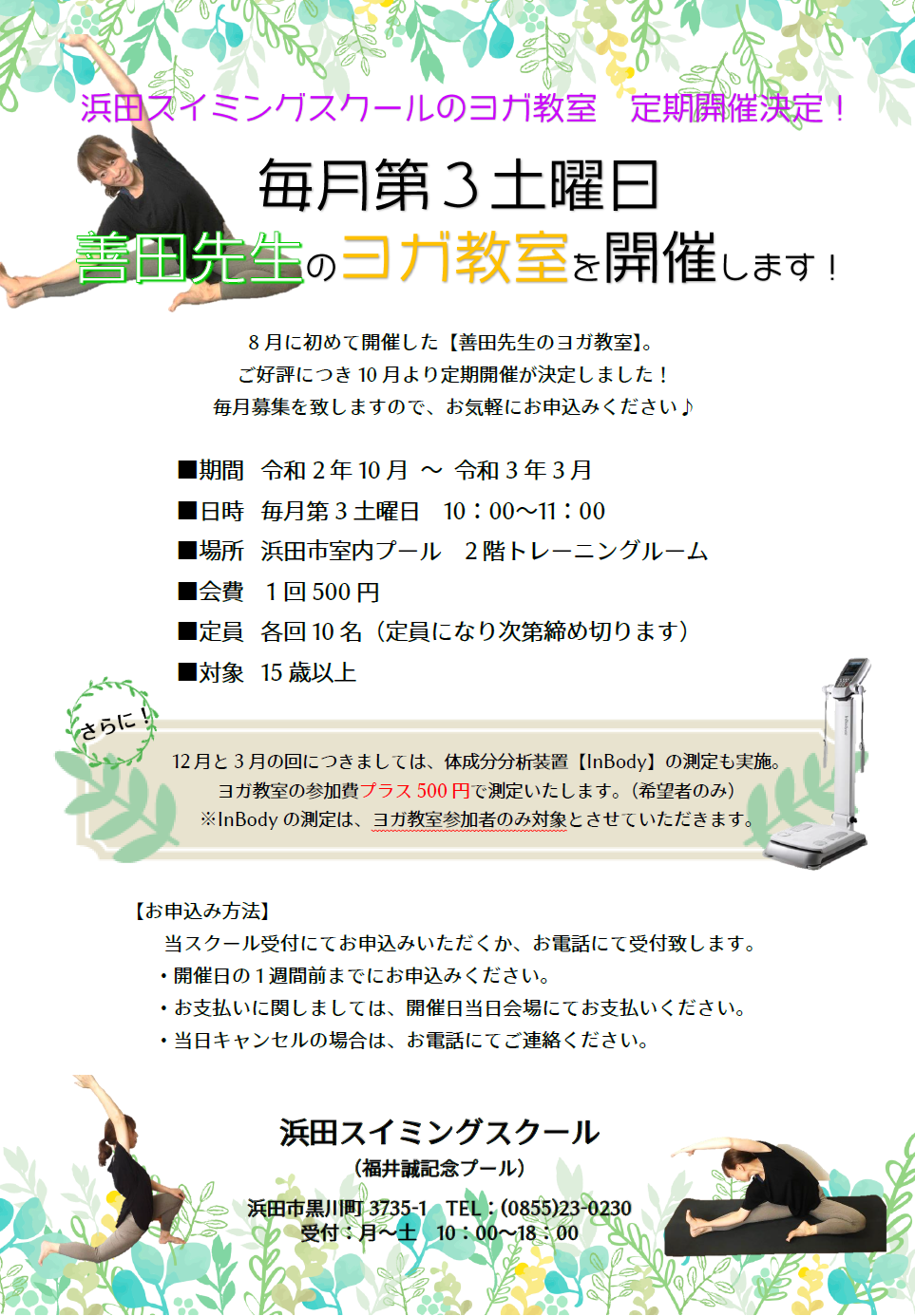 10月より定期ヨガ教室を開催します!浜田スイミングスクール。