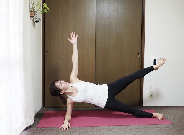 片足を上げたサイドプランクのポーズ エーカパーダヴァシシュターサナ のやり方とコツ資格のマナビバ。