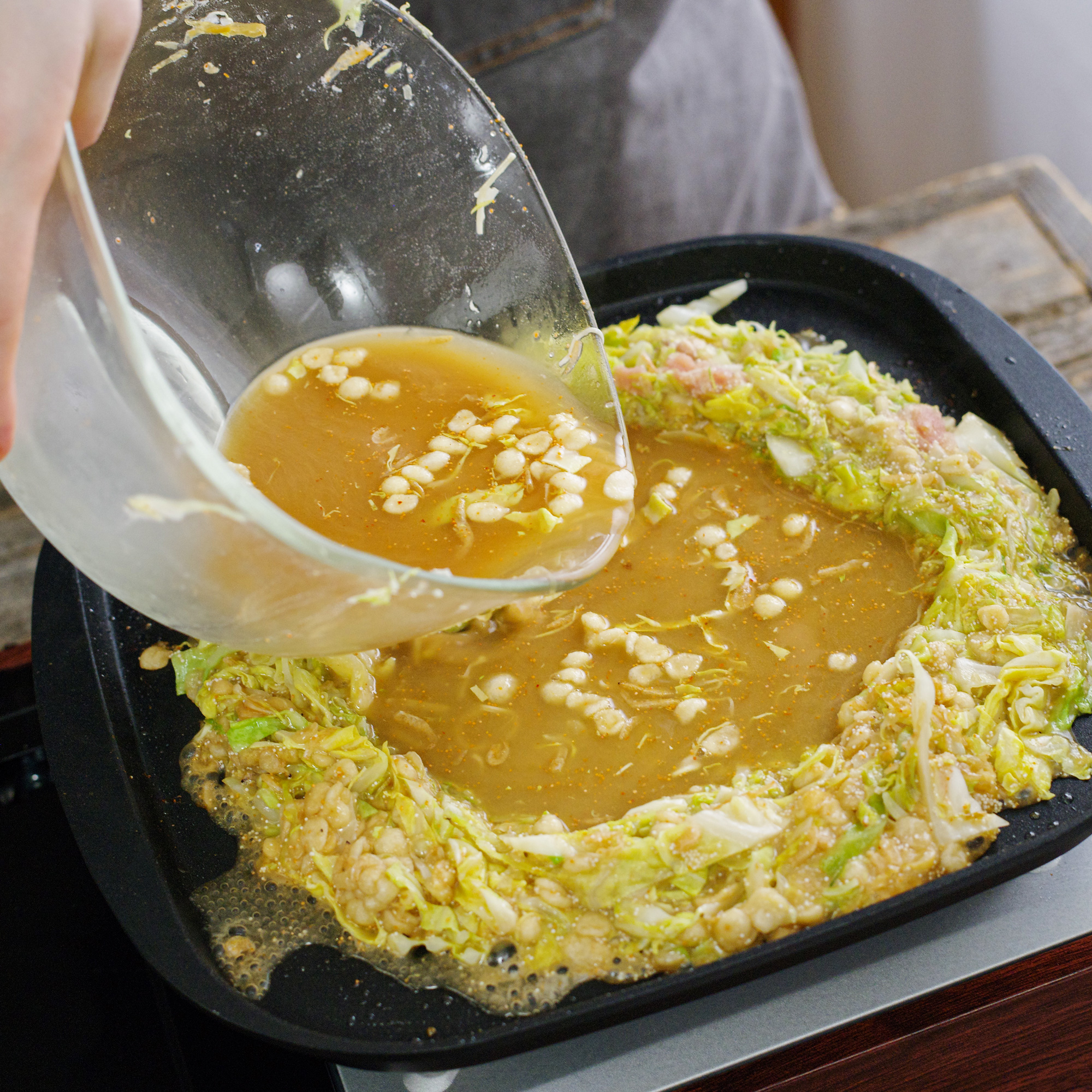 小麦を使わない明太子もんじゃが美味すぎる‥, 無性にソース系食べたくなる時ない?😂, そんな時でもこのレシピなら, 米粉を使ってグルテンフリー!!,そして簡単美味い!!はい!神!, ぜひぜひ作ってみて🤤✨, 作り方はこれ👇,材料 , ・お水150cc, ・米粉30g,・もやし一掴み 60gくらい , ・キャベツ65gくらい, ・ダシ小さじ1, ・ウスターソース・醤油大さじ1 2,。