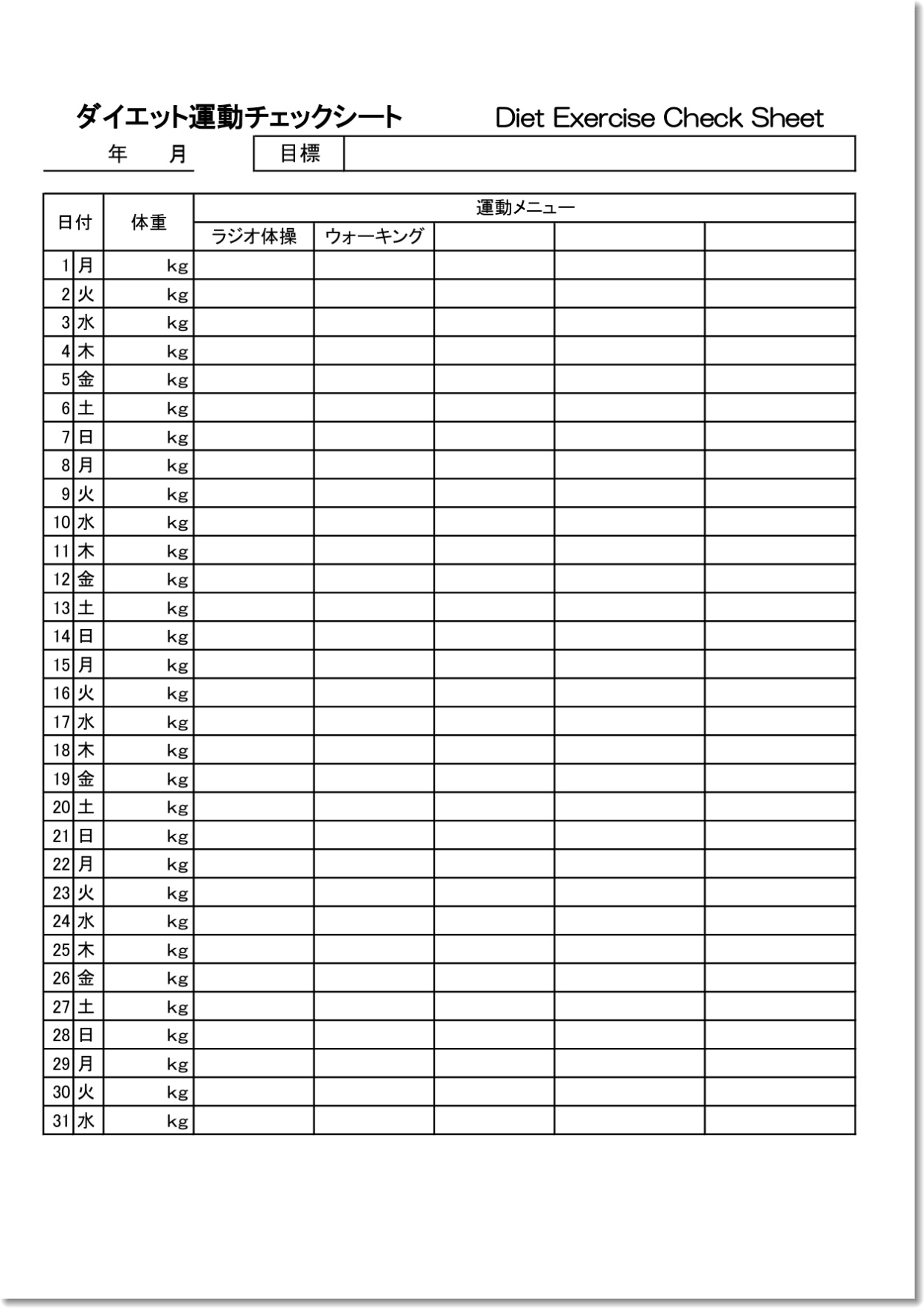 運動チェック表 自主シート・運動量リスト・一覧表 1か月の運動不足解消・Excel・Word・PDFの無料テンプレート。