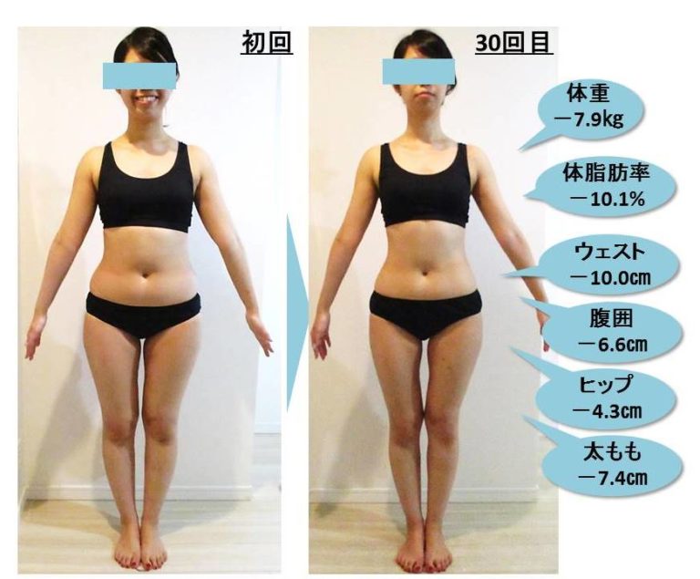 ダイエットモニター2ヶ月ビフォーアフター 体脂肪率:-4.6%、体重:-3.6kg 福岡のパーソナルジム・ピラティスブログ「ダイエットは明日から」。