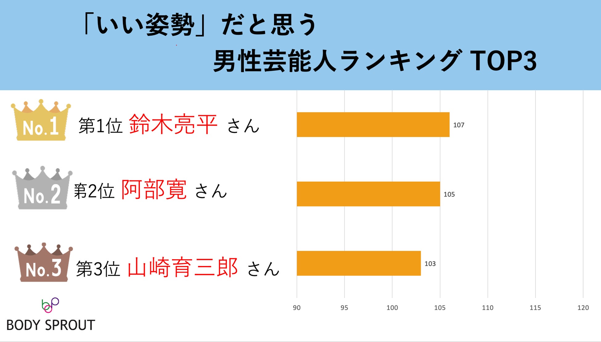 いい姿勢の芸能人ランキング発表! 男性1位は鈴木亮平さん、女性1位は天海祐希さんに株式会社ボディスプラウトのプレスリリース。
