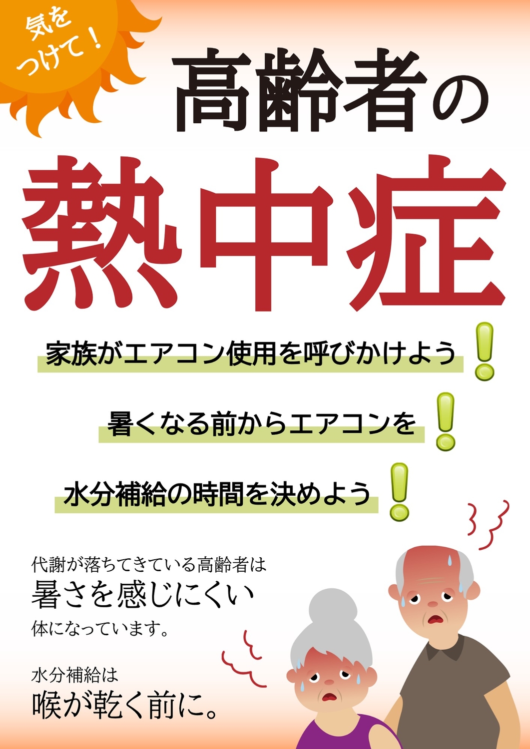 体調不良の高齢者が描かれた熱中症の注意喚起向けポスターの無料ポスターテンプレート 20435 - デザインAC。
