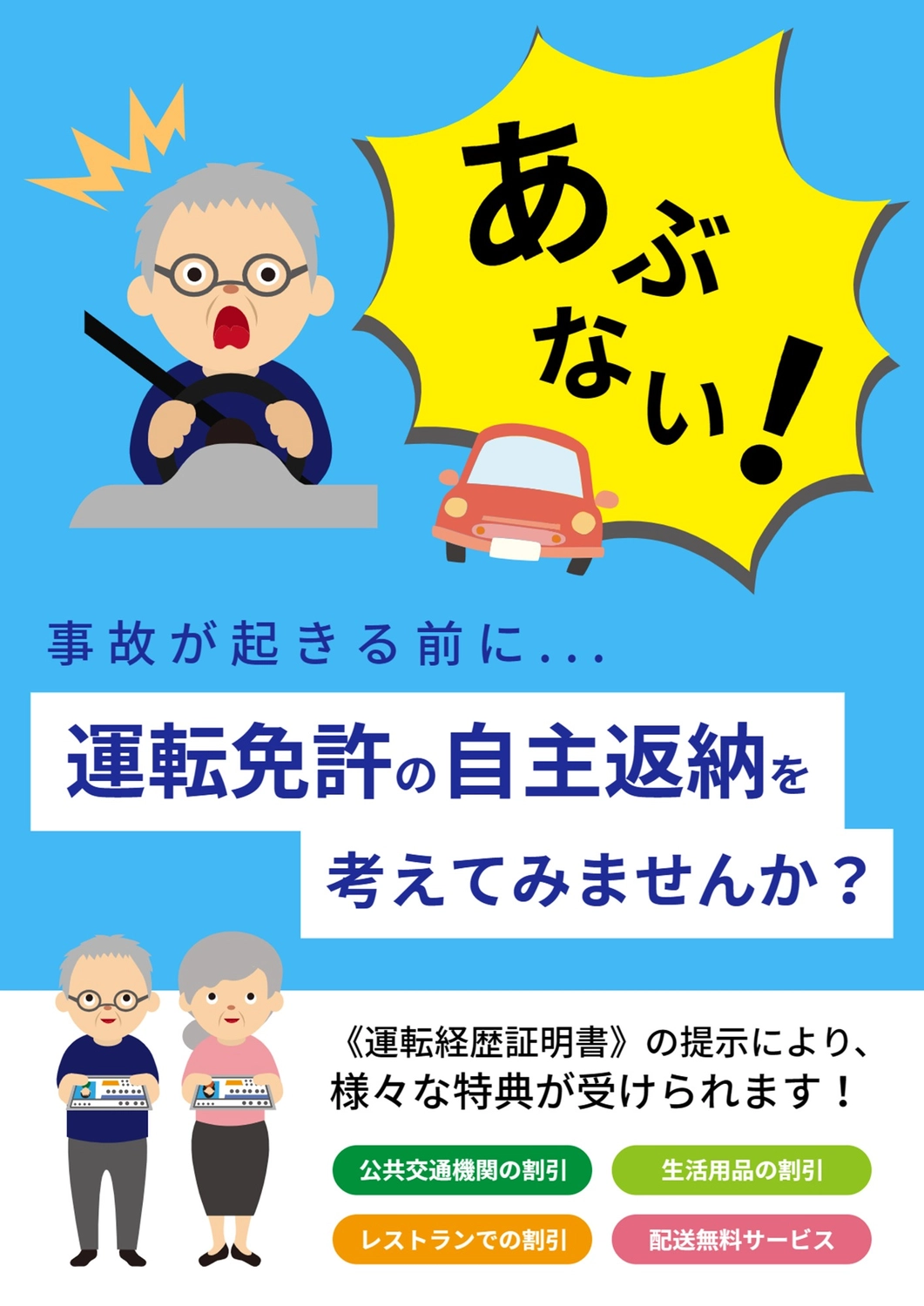 高齢者のと車のイラストを使った青の運転免許返納のポスター の無料ポスターテンプレート 13477 - デザインAC。