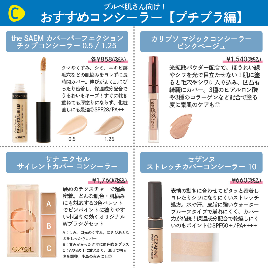 C CHANNEL-シーチャンネル- on X: "ブルベ肌さん向け💙価格別 おすすめ優秀コンシーラーマスクをしている今だからこそ、目元のクマなど徹底的に隠したい! そんなときにオススメの機能性goodなコンシーラーをプチプラ・デパコス別にまとめました🤗コンシーラー。