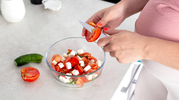 妊娠中の女の子がきゅうりとトマトの野菜サラダを用意します野菜中のビタミンと主要栄養素を含む妊婦の栄養の概念適切な栄養妊娠中の食事テキスト用のスペースをコピーする- 1人のストックフォトや画像を多数ご用意 - iStock。