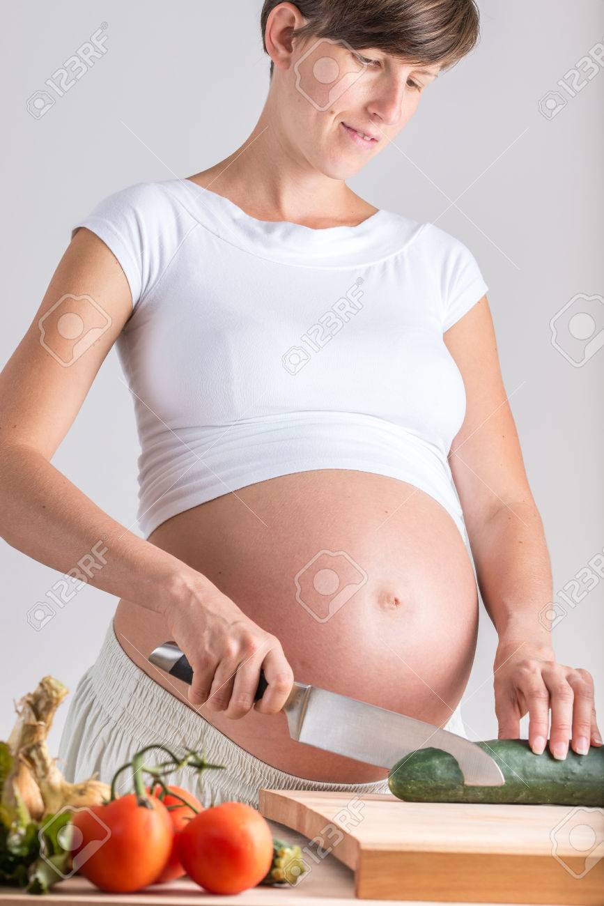まな板、キュウリとトマトを見越しての静かな笑顔の健康的なサラダを作る台所のカウンターに立っている裸の腫れた赤ちゃん腹の魅力的な妊娠中の若い女性。の写真素材・画像素材Image 30891823。