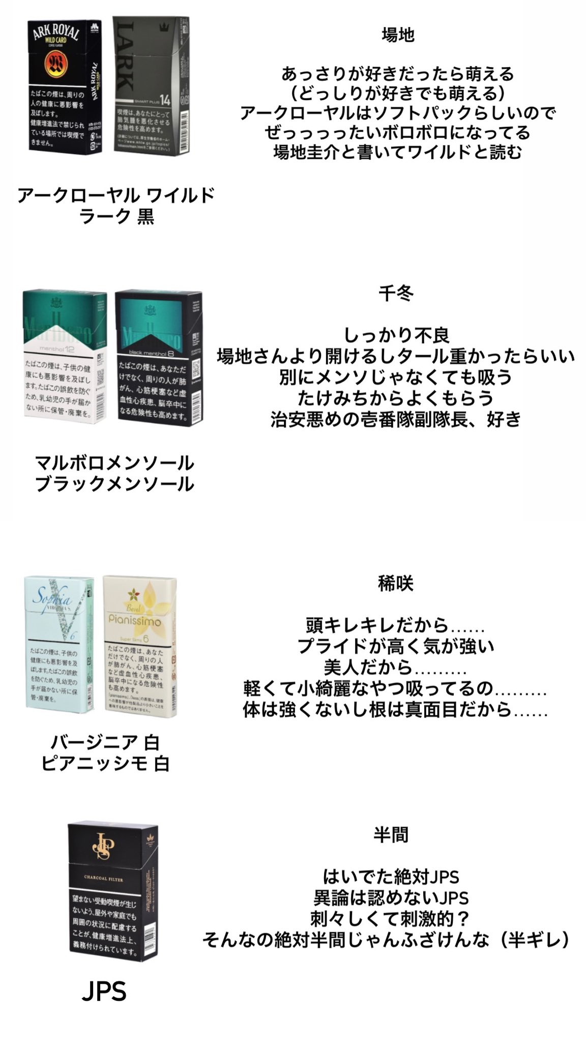 甘粕❗️ on X: "私の独断と偏見による吸ってそうな煙草 n番煎iじ 廃i盤とか知らん 多分全員 長i内とかキiヨマiサとかはいないtkrvプラス ? https:t.co 2d9q36WPuz"X。