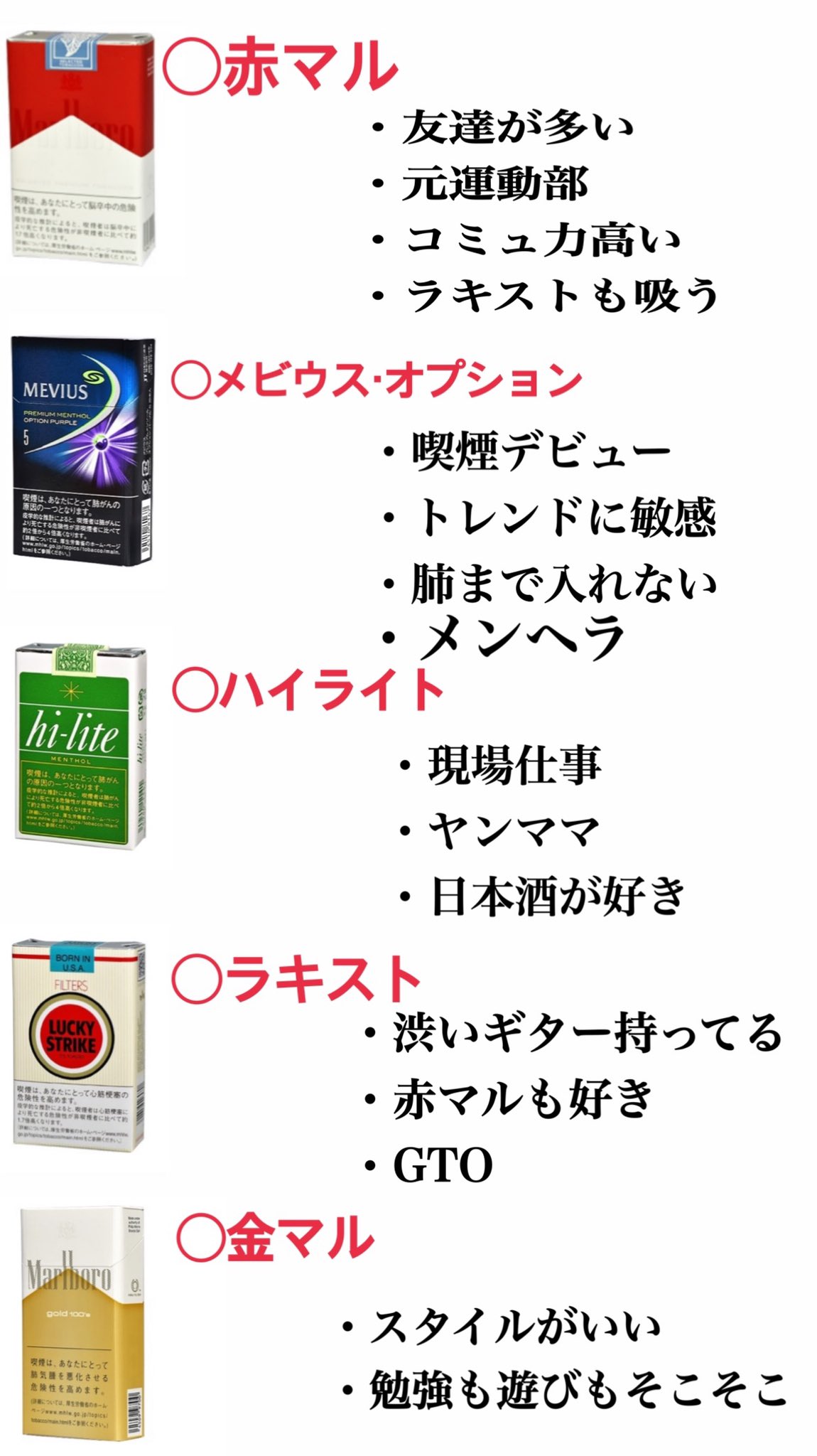 mako⁽˙⁸˙⁾ こりんon X: " 炎上覚悟 いまバスってる独断と偏見によるタバコの銘柄イメージについて私も思うところがあったので作ってみました。※すべての人が私の偏見に当てはまるわけではありません。 ここはこうだろ!等協議あれば全面的に受け付けます!独断と。