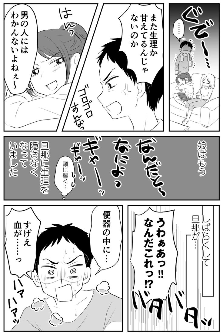 娘の生理と父親>生理痛は甘え?「うわああ」血を目の当たりにした旦那がトイレで叫ぶ 中編まんがママスタセレクト。