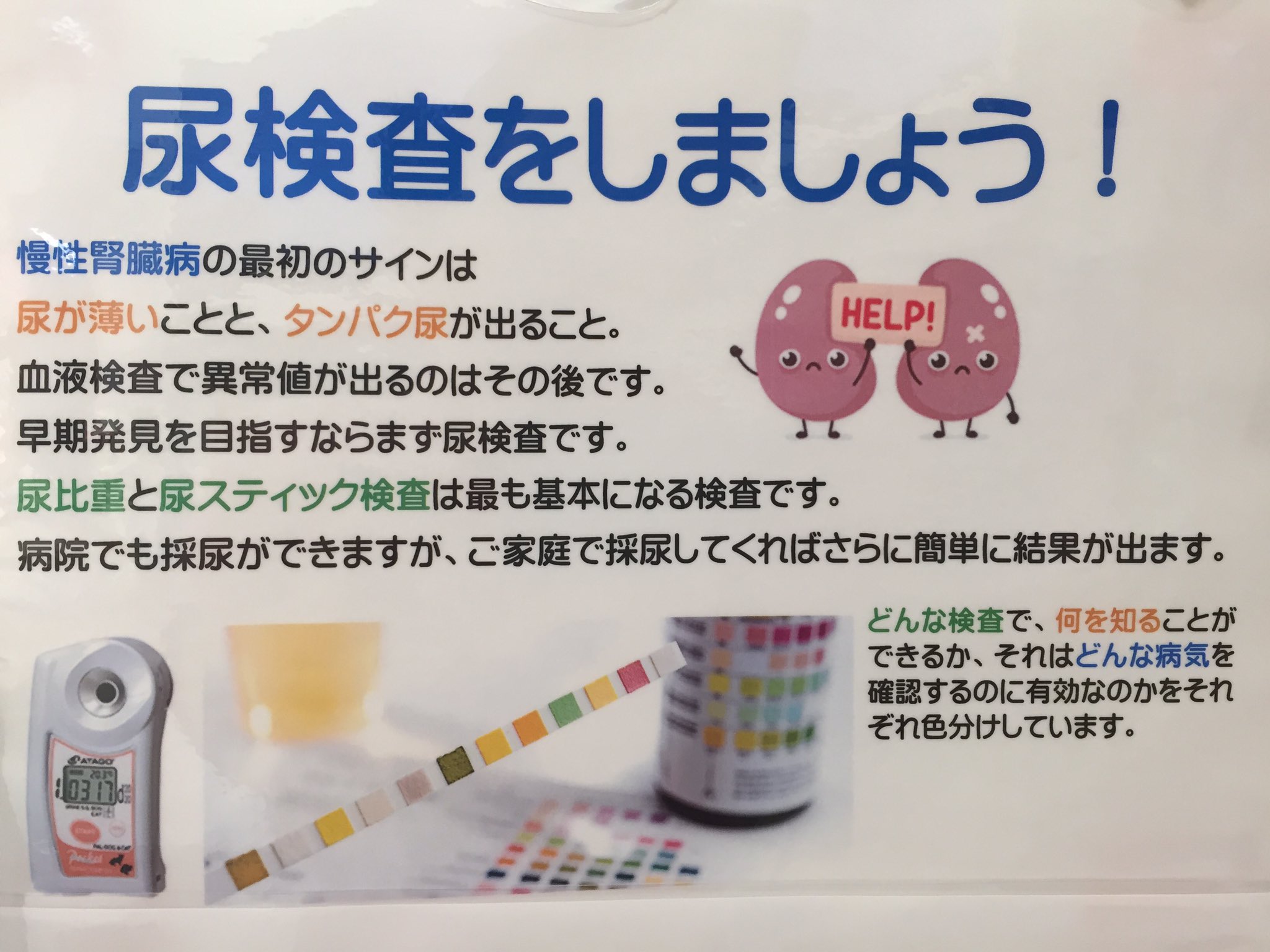 ハート動物病院 on X: "今月の掲示板に合わせて、展示の所で、尿検査のことを出しています。 慢性腎臓病の早期発見に尿 検査、というのは知られていますが、どんな検査が有益なのか、というと、今のところ、尿比重の検査とスティック検査でタンパク尿を確認することです。