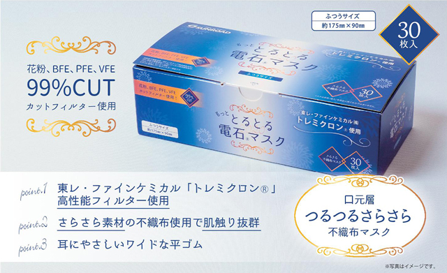 毛羽立たないマスク 「もっと とるとる電石マスク」 肌に優しいマスク PM2.5対応マスク 高機能不織布マスク飛沫ウイルス、花粉や細菌もキャッチ!トレミクロンマスク株式会社サンロード。