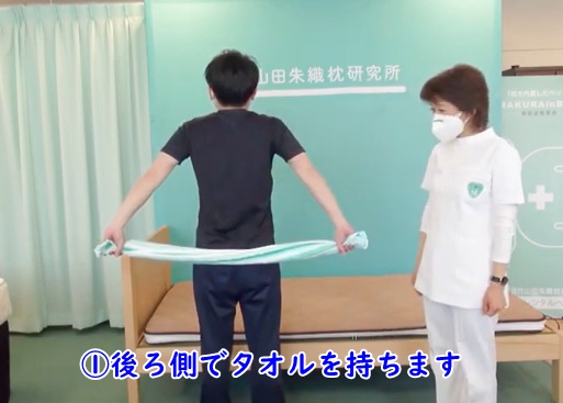お風呂上がりにタオルを使った立ったまんま体操・ストレッチを解説オーダーメイド枕の山田朱織枕研究所。