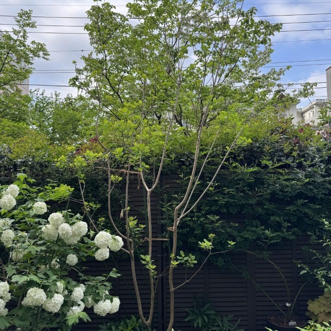 スモークツリー”ヤングレディ”という矮性種なんですが コンパクトにまとまるはずがもう背丈をこえております! が!そもそもスモークツリーって5メートルとか10メートルとかになる木なので そういう意味では全然コンパクトですね☻ 今年の花後はもうちょっと。