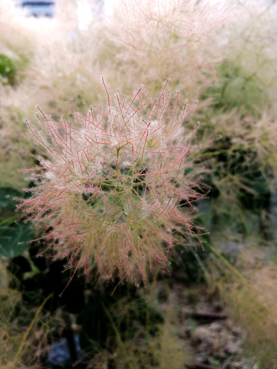 スモークツリー , ”ヤングレディ”という矮性種なんですが, コンパクトにまとまるはずが , もう背丈をこえております!,が!そもそもスモークツリーって, 5メートルとか10メートルとかになる木なので, そういう意味では全然コンパクトですね☻,今年の花後はもうちょっとしっかり切り詰めて, サイズダウンしようと思ってます。, 花壇に植えてるんですが, 下に植わっているエキナセアとかに,。