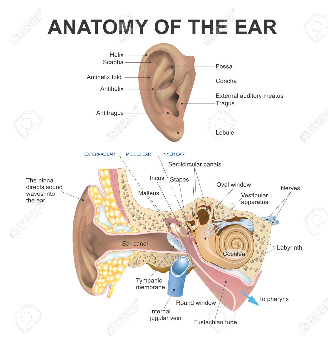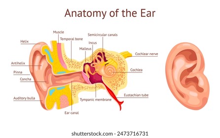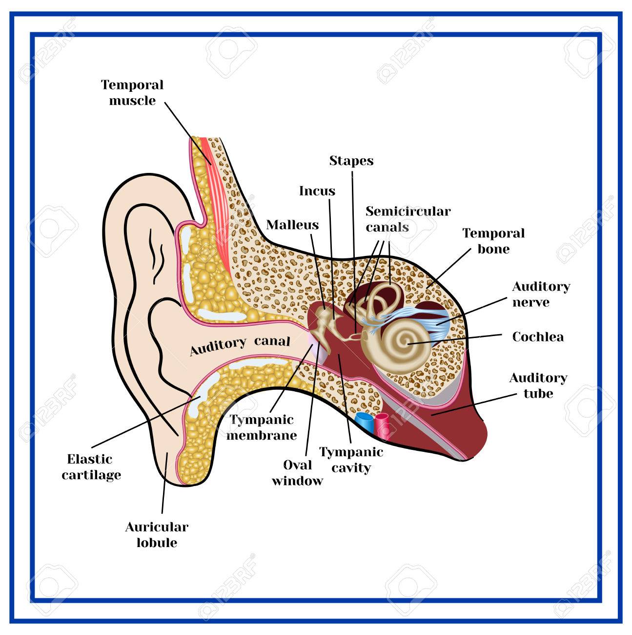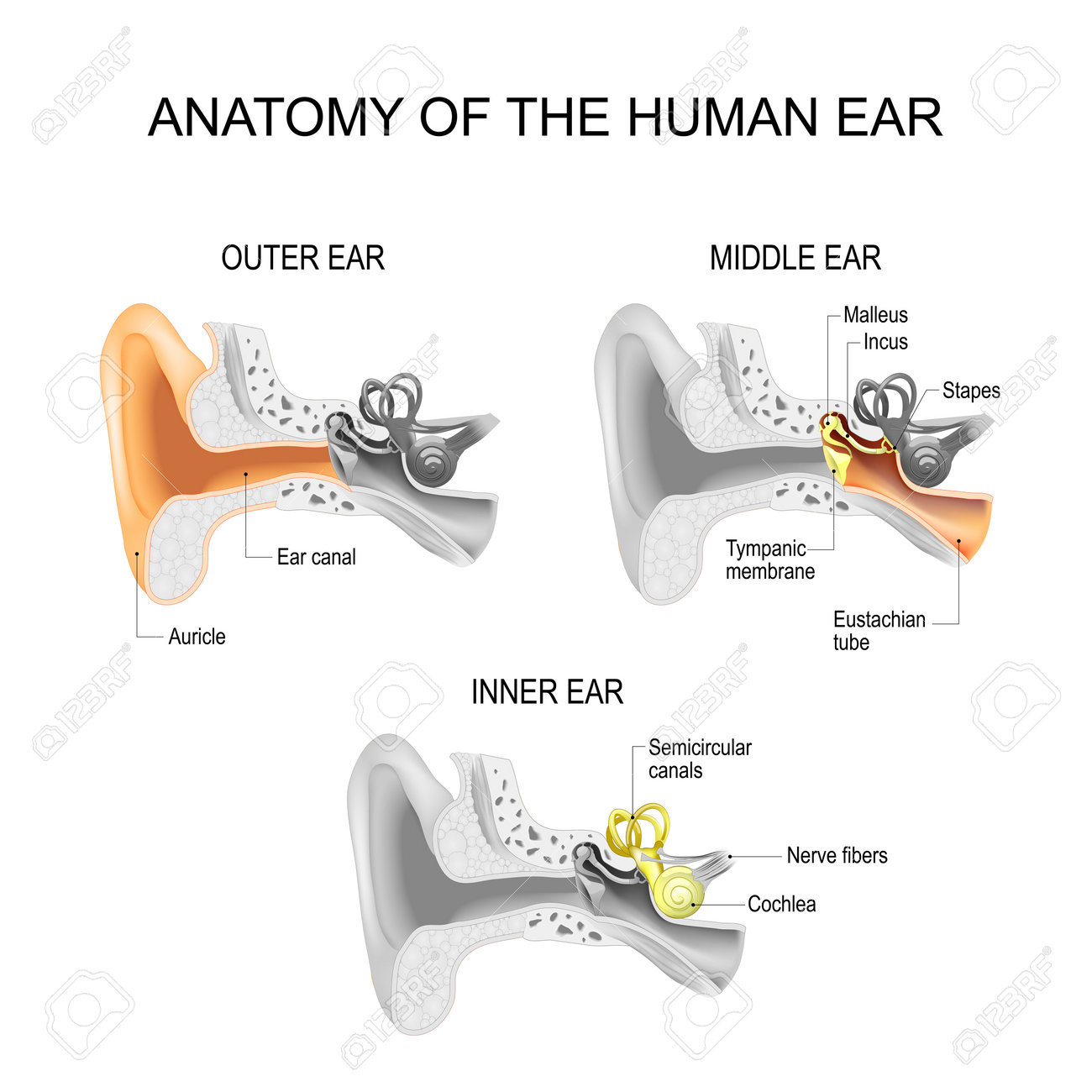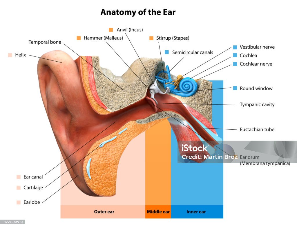 人間の耳の解剖学。耳の構造図。人間の耳は、外耳、中耳、内耳で構成されています。のイラスト素材・ベクター Image 180301021。