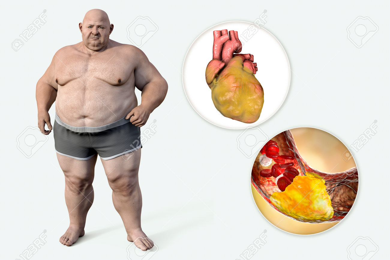 肥満とアテローム性動脈硬化症、肥満の人の血管の狭窄につながる肥満の心臓の動脈内のアテローム性プラークを示す概念的な3Dイラストの写真素材・画像素材Image 198250726。