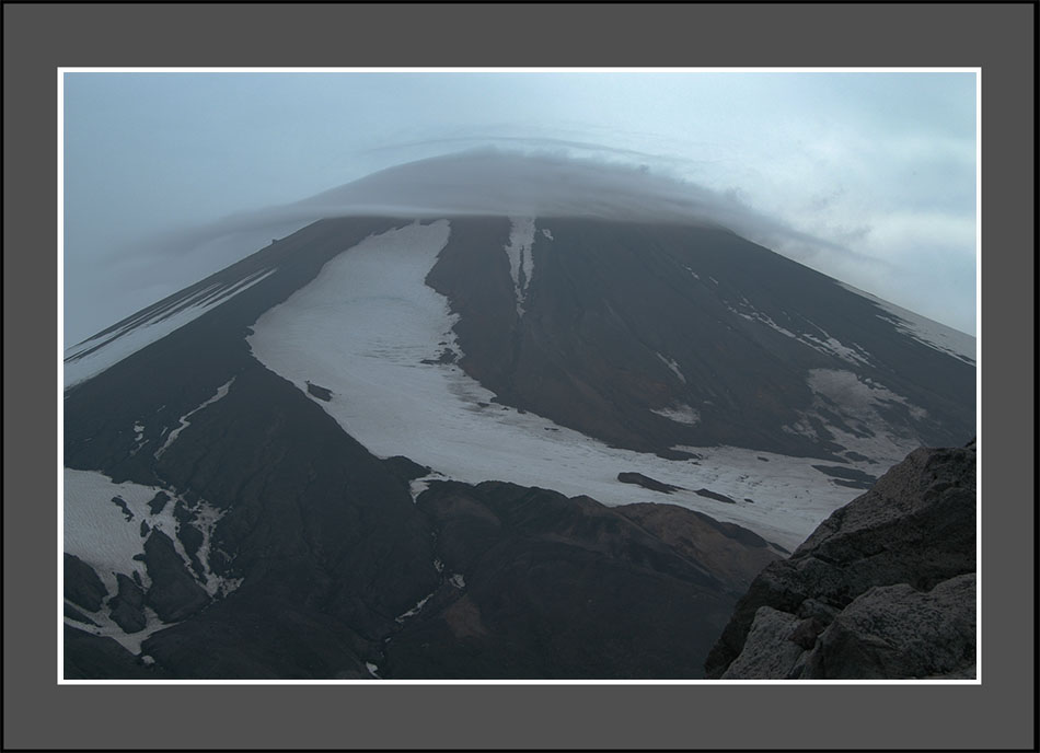 笠雲の覆う燧ケ岳私達のいた尾瀬ヶ原は小雨が降っていましたが、燧ケ岳を望むとちょうど山頂付近に笠雲が掛かっていましたFlickr。