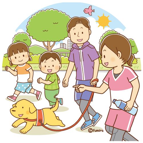 公園でジョギングをする家族のイラスト モノクロ子供と動物のイラスト屋さん わたなべふみ。