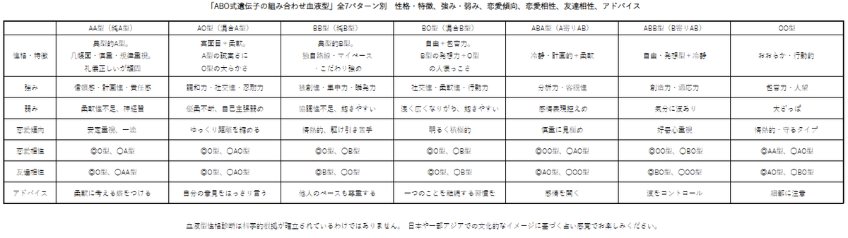 性別 × 血液型」全16パターン「ABO式遺伝子の組み合わせ血液型」全7パターン 性格・特徴、強み・弱み、適職、恋愛傾向、恋愛相性、友達相性、アドバイス青山睦AoyamaMutsumi。
