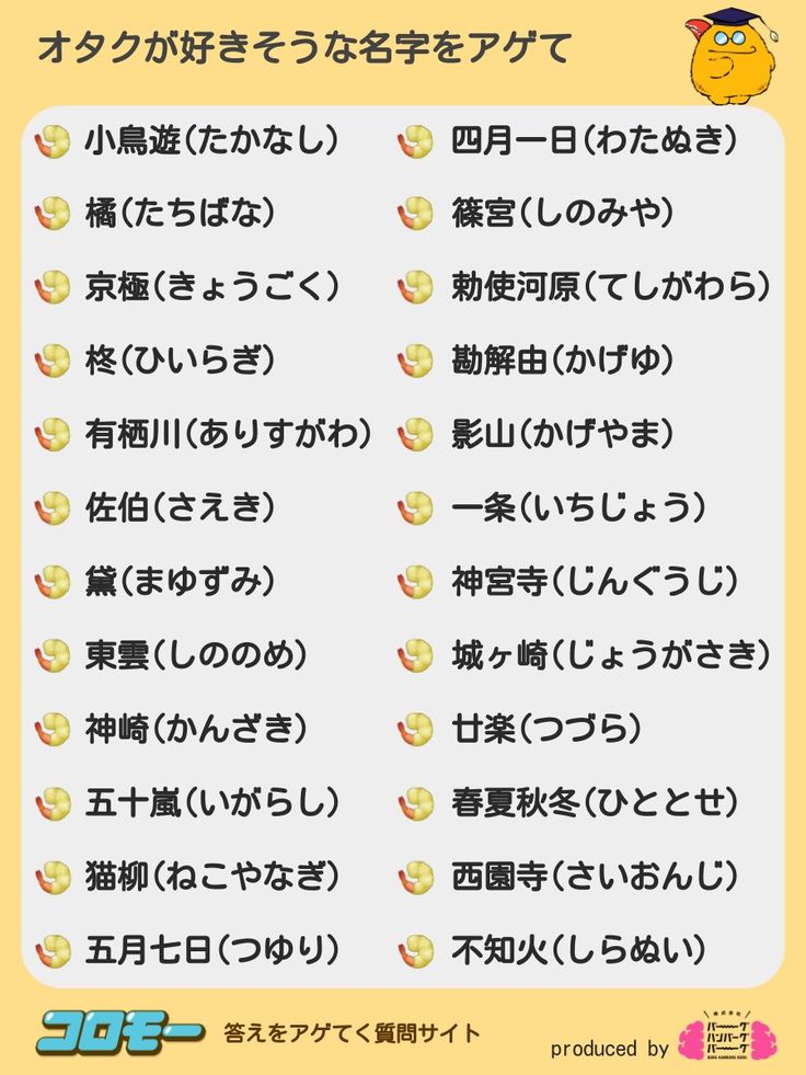 コロモー on Twitter: "みんながアゲてくれた『オタクが好きそうな名字』"。