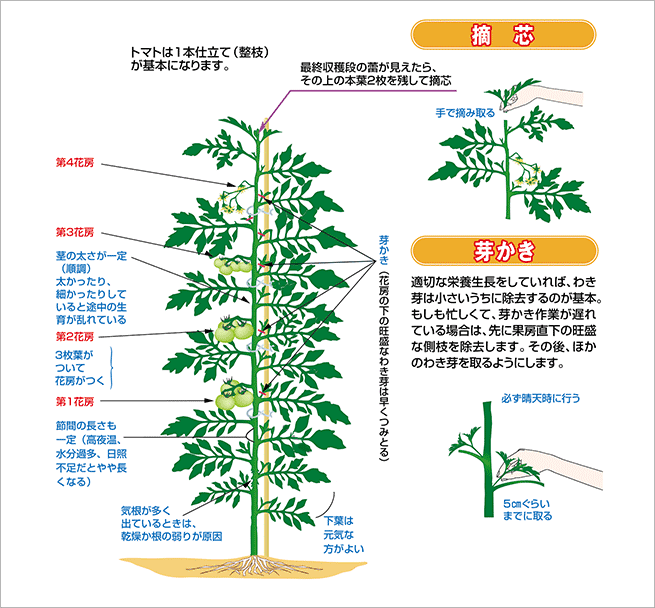 トマトの剪定 摘心や摘果の方法や時期家庭菜園での栽培管理の仕方を覚えておいしいトマトを収穫しよう。