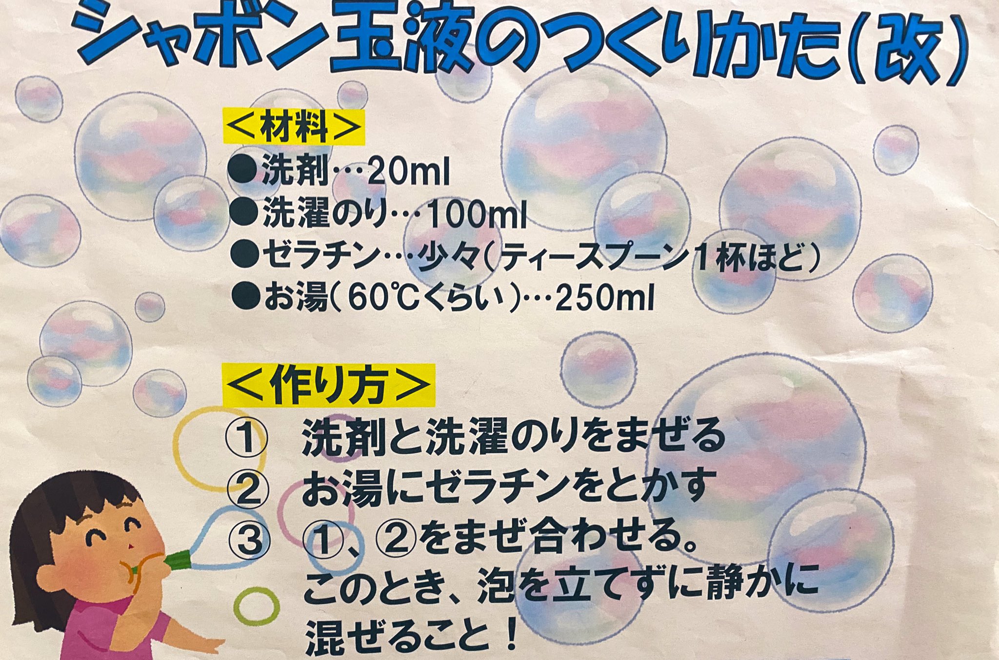 むう☺︎🎀 on X: "科学館🔬で教えてもらったシャボン玉レシピ🫧 まじで最強だったからやってみてほしい! 無限にシャボン玉出てくるwwww材料多 て人もいつもの洗剤➕水→お湯に変えるだけでも割れにくくなるみたい👍🏻✨ https:t.co OKqq9fZHLa"X。