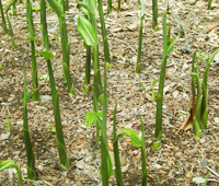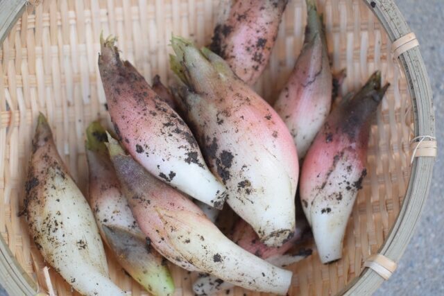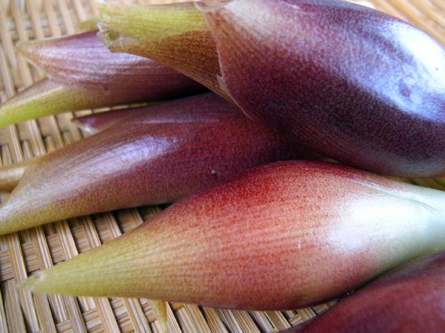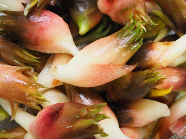 茗荷筍みょうがたけ 薬味などによく使われる茗荷は花蕾で、茗荷筍は若い茎の部分を指します。夏と秋の年2回たくさん採れる茗荷に対して、茗荷 筍の収穫期は春から夏前の短い期間だけ。柔らかな食感とさわやかな風味が、初夏にぴったりの山菜です。 国内で茗荷の生産。