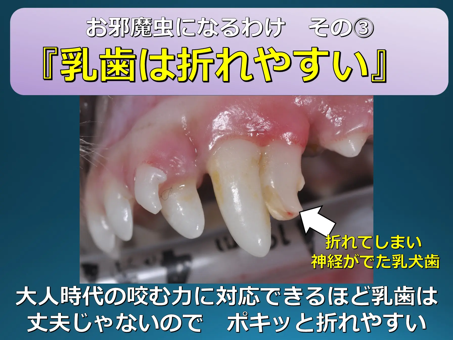 犬の乳歯の病気で、歯が折れてしまう破折という病気があります。 硬い物を噛んでいると、乳歯のキバ 犬歯 が折れてしまう事があります。折れて露髄 ろずい してしまうと感染を起こすリスクがあり、場合によっては抜歯する事になります。 噛む事が好きなワンちゃん。