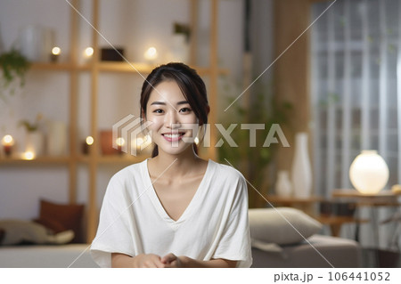 家のリビングでで心安らぐひとときを過ごす日本人の若い女性「AI生成画像」のイラスト素材106441052- PIXTA。