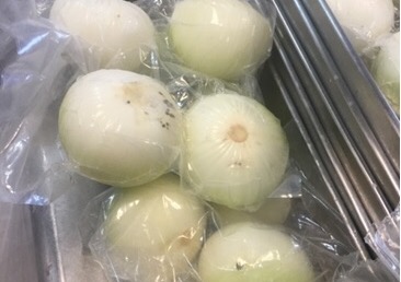 輸入ムキ玉ねぎに黒いカビのようなものがついている株式会社まつの。